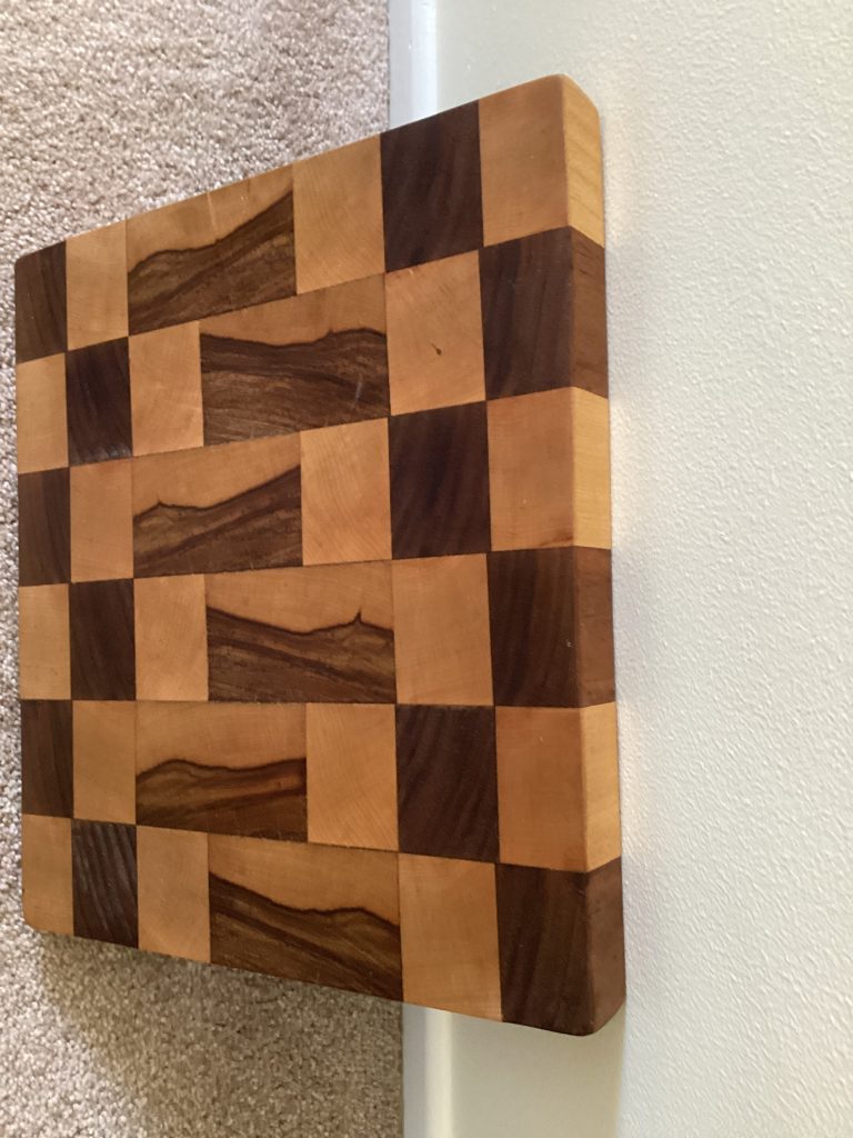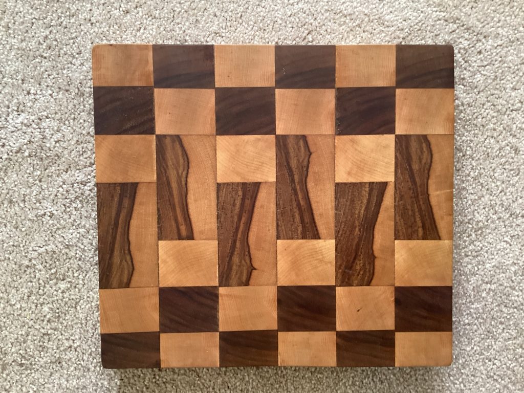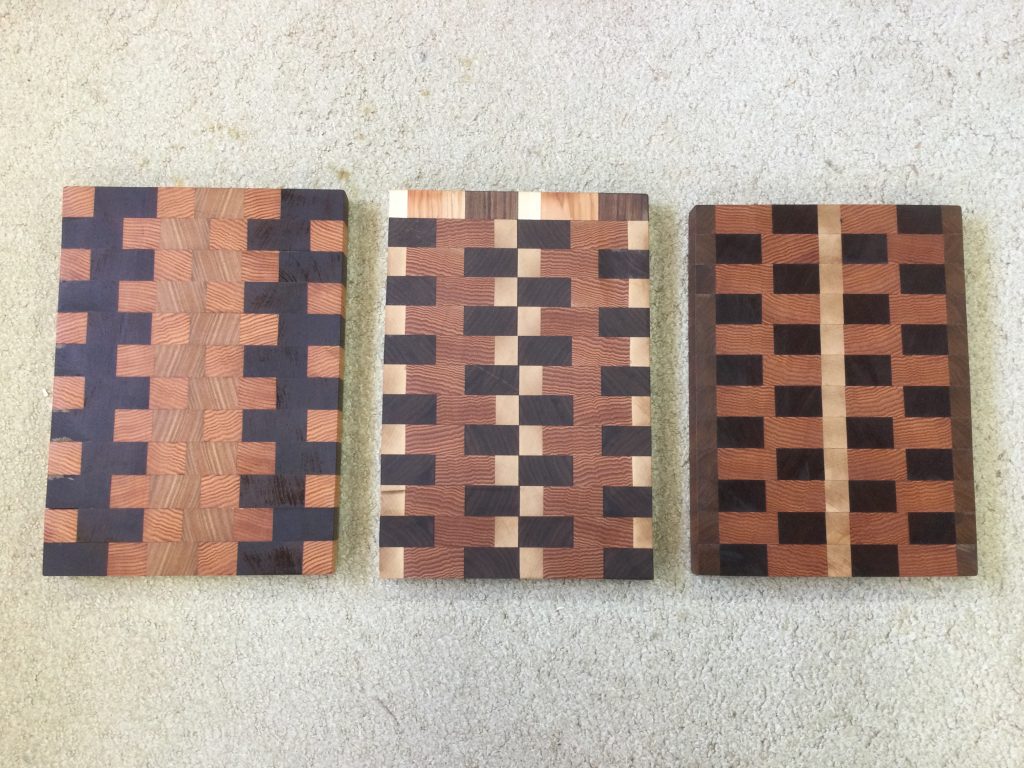 3 similar end-grain boards created using a variety of woods– maple, elm, mahogany, walnut, douglas fir.