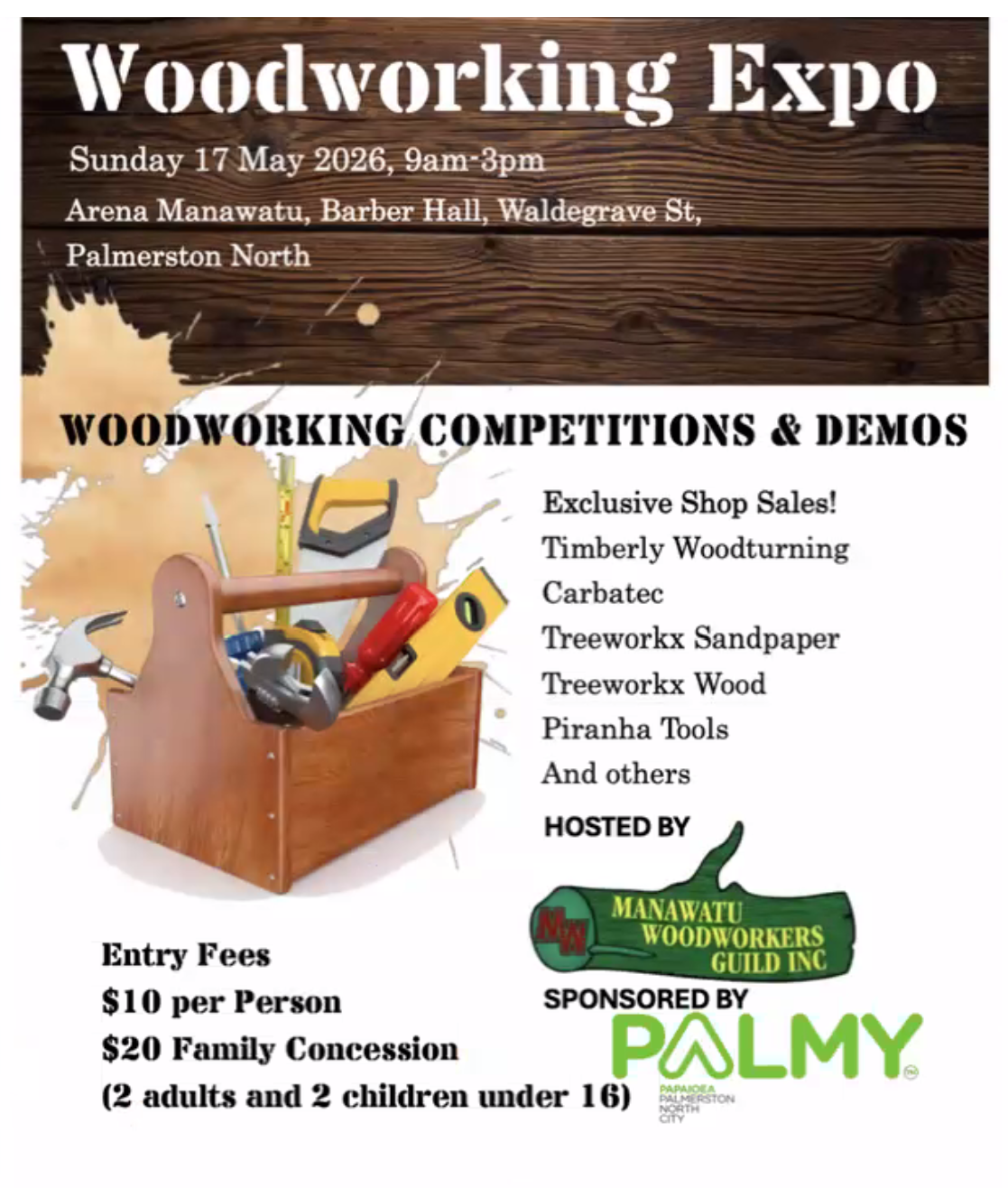 Sunday 17th – Manawatu Woodworkers Expo and the Golden Chisel Competition. Barber Hall, Waldegrave Street, Palmerston North. More information coming. More information here.